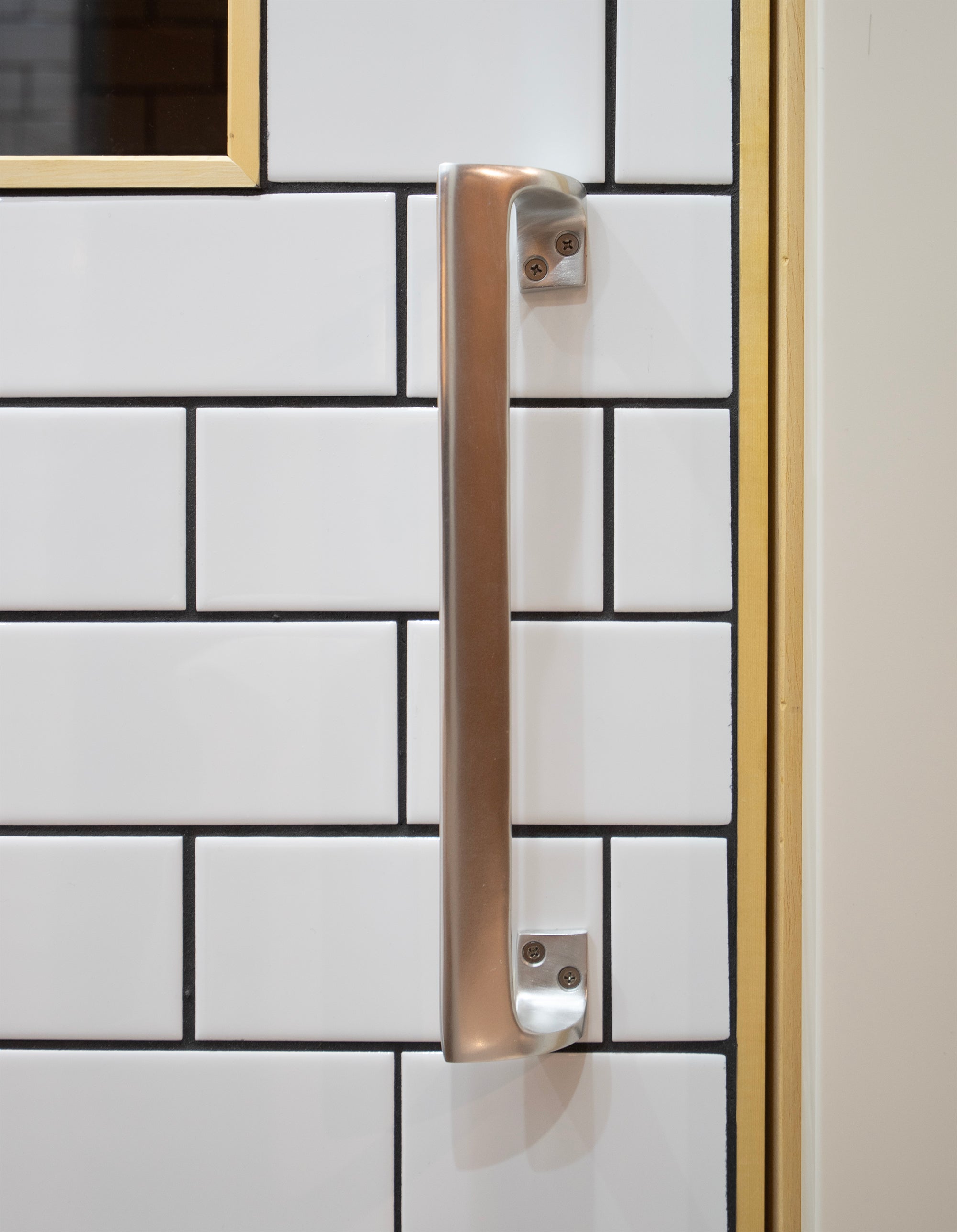 工業的な雰囲気のあるシンプルなハンドルで、取付も正面からのビス留めなので、後付け可能です。アルミ素材なのでスチールやステンレスよりも柔らかな印象で、握った際の肌触りの良いアイテムです。 -