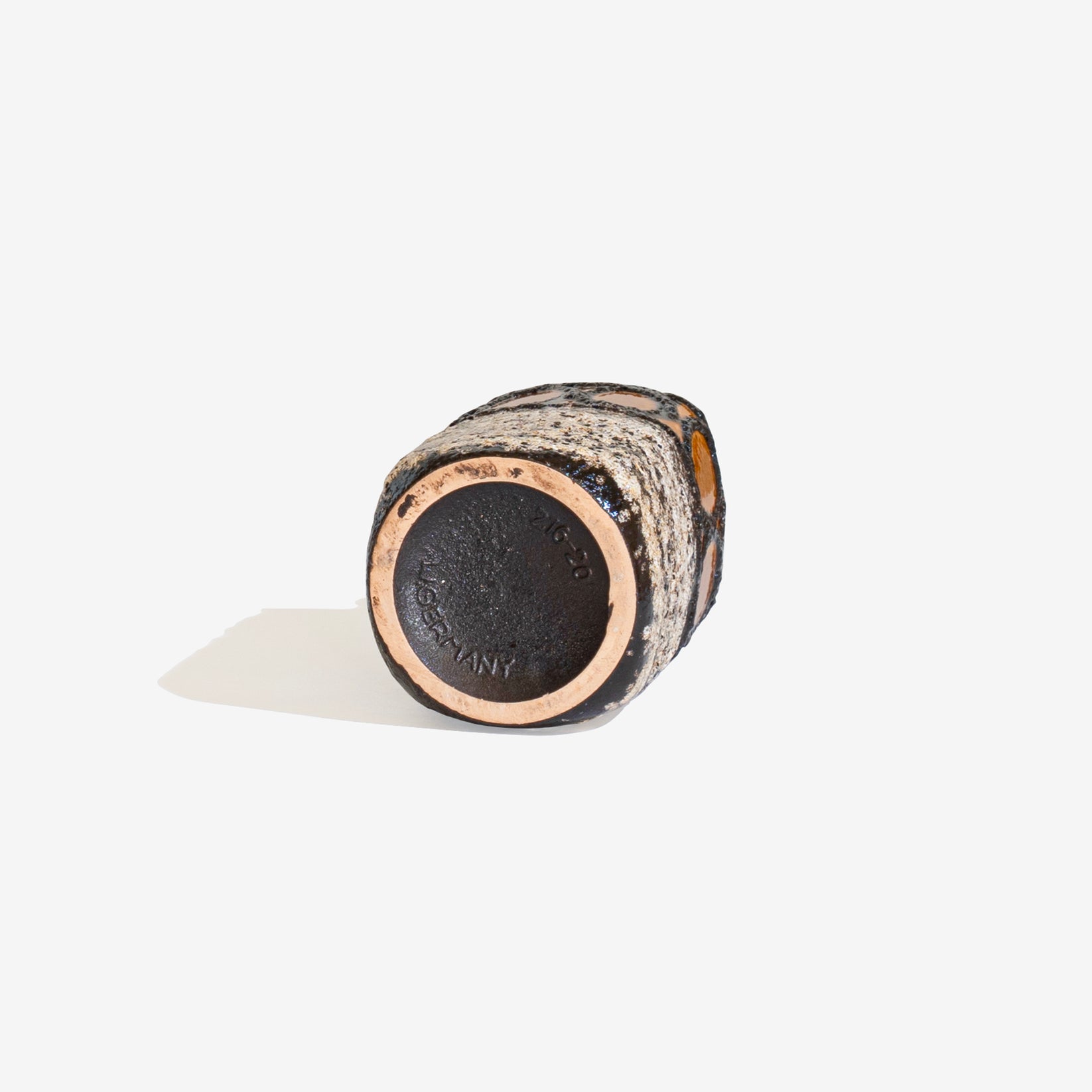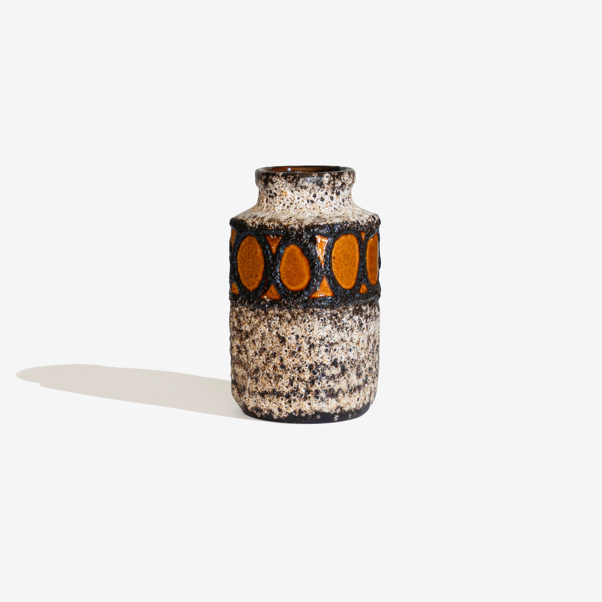 1970年代にSCHEURICH社にて作られた Fav Lavaのフラワーベース。白、黒、そして鮮やかな黄土色の釉薬の絶妙な組み合わせと、ファットラバの象徴的な質感が特徴です。
