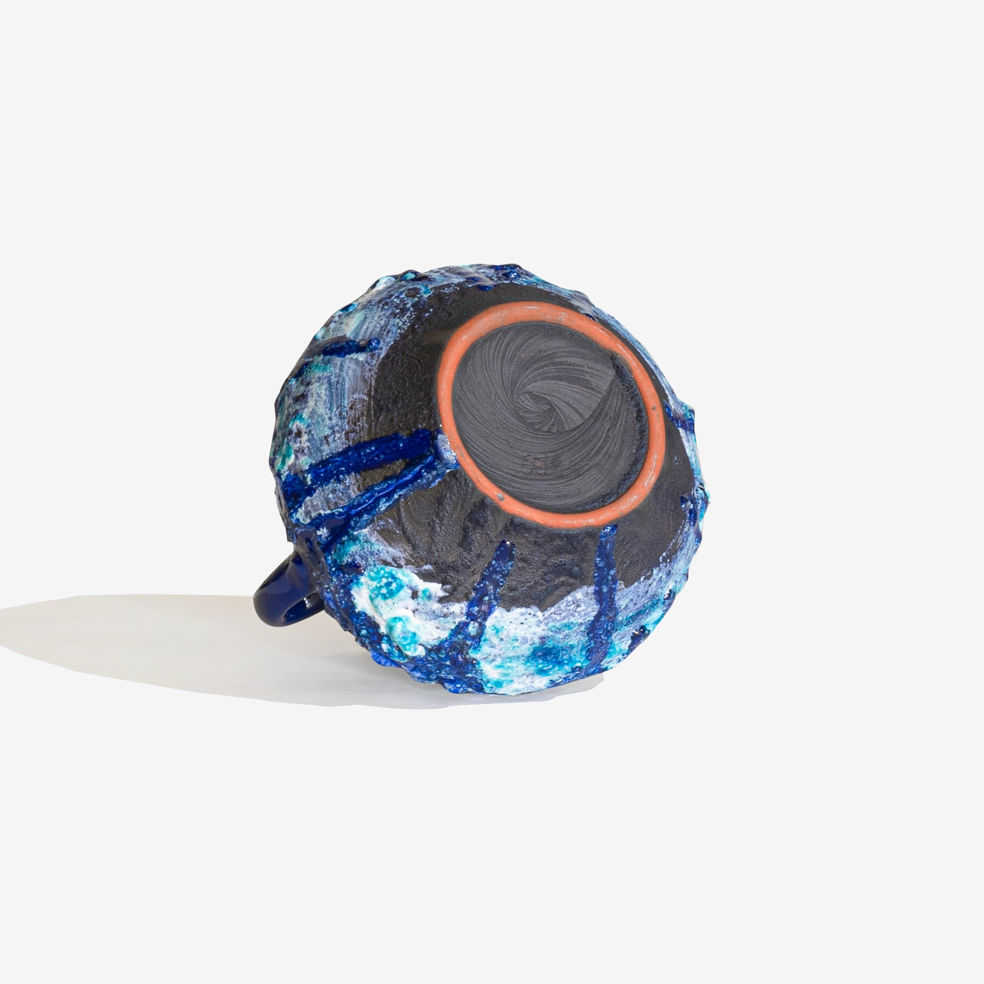 溶岩のような質感と鮮やかな青い釉薬が特徴で、複雑な模様と対照的な色彩の「CAPRI」装飾が施されています。サイズ:外寸 φ190 × H190 mm