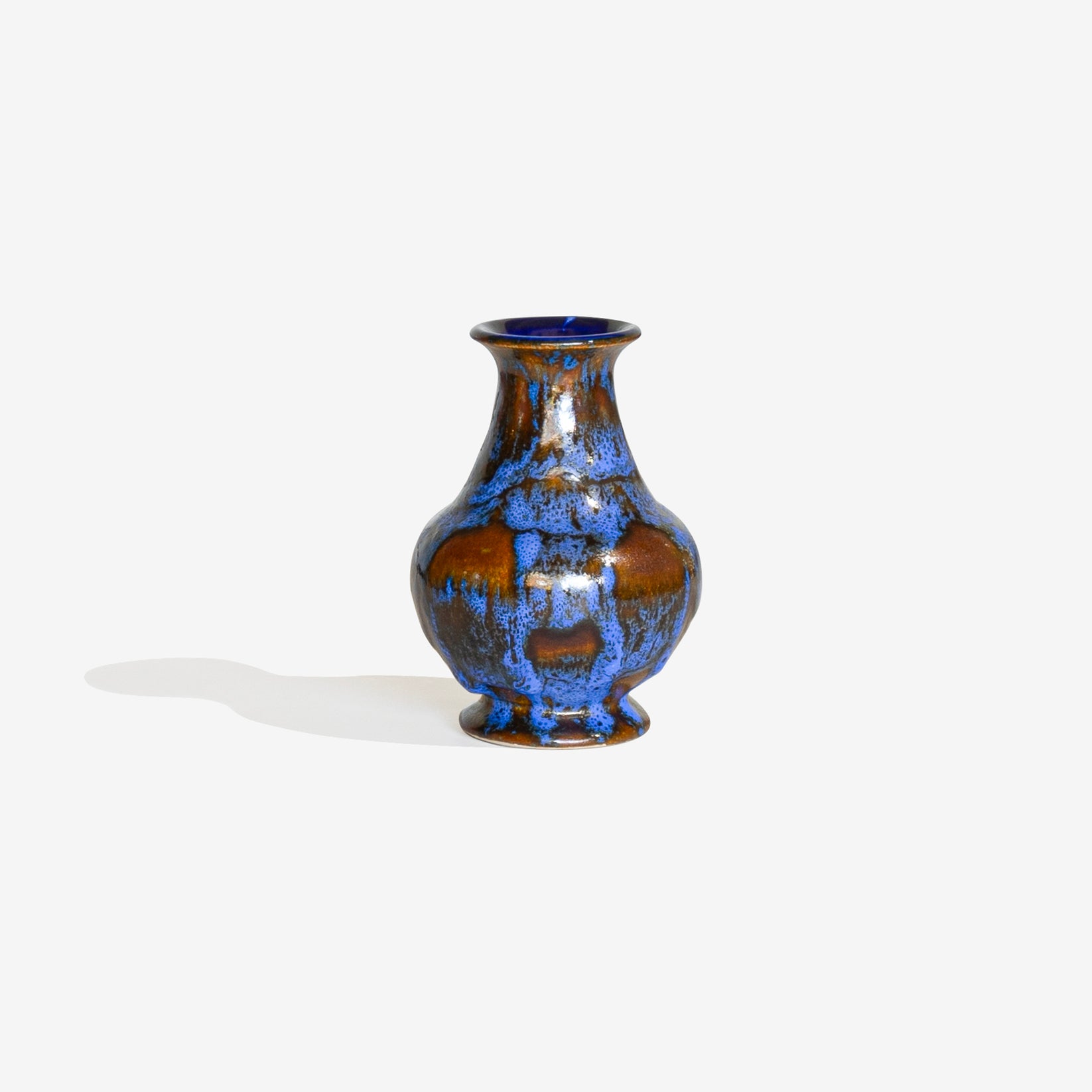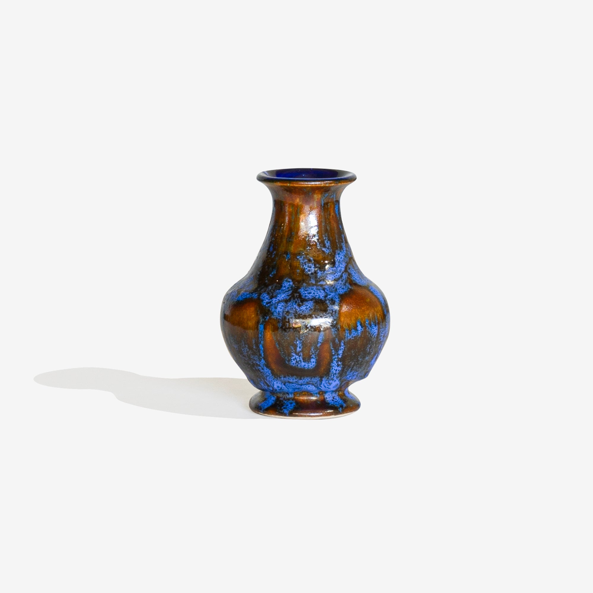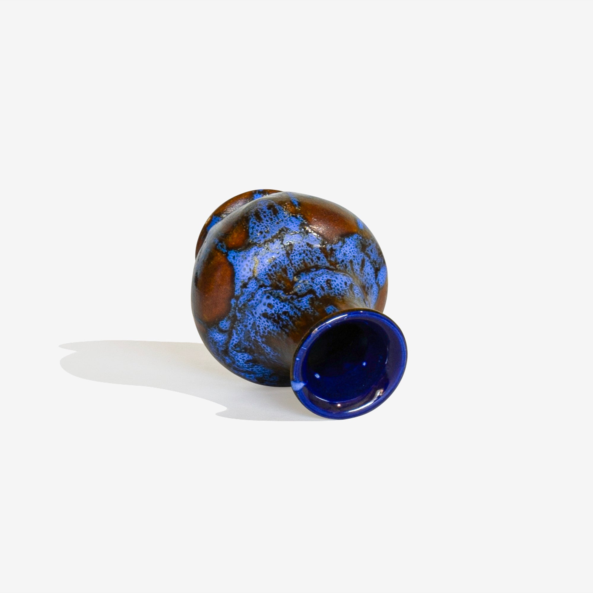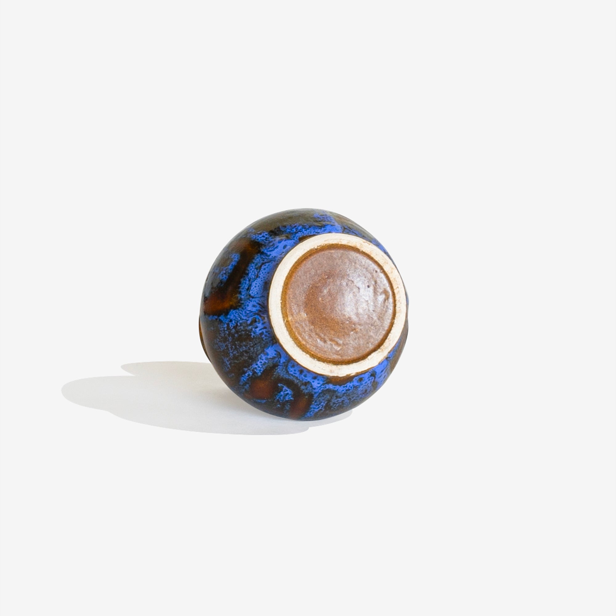 深みのある光沢のあるブラウンとブルーの釉薬が印象的です。サイズ:外寸 φ100 × H140 mm