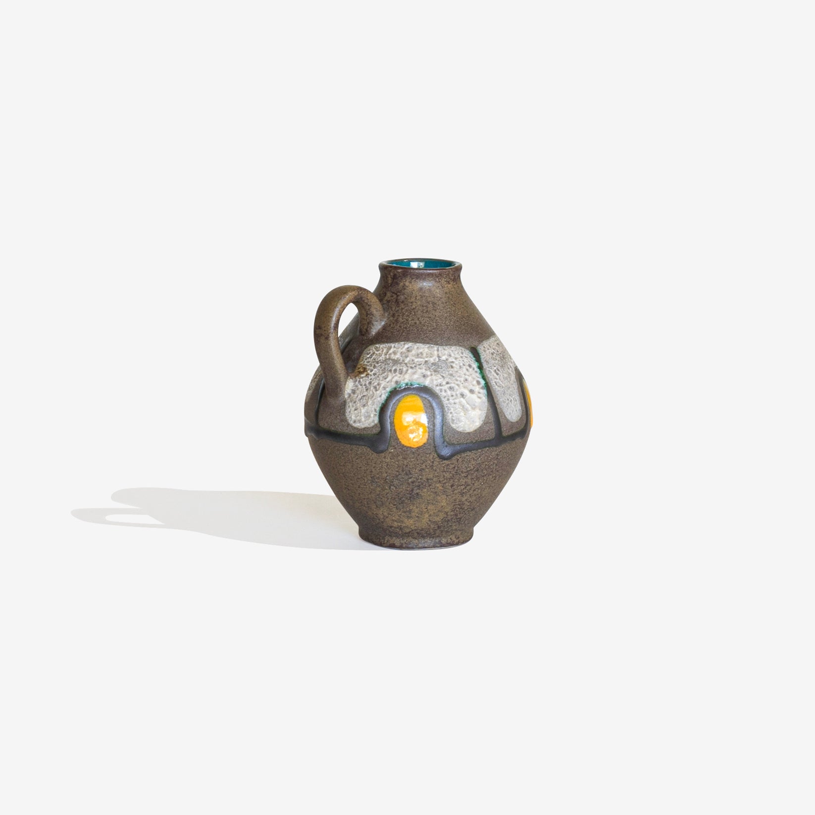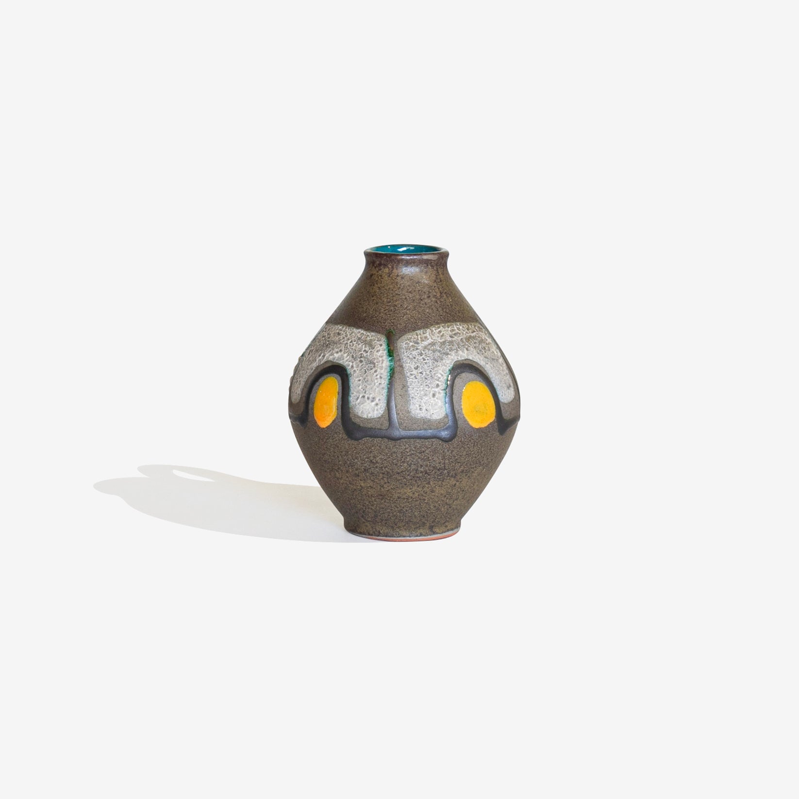 CARSTENS TONNIESHOF 社が1960年代に製造した Fav Lavaのフラワーベース。深みのあるアースブラウンの釉薬に、大胆なグレーとクリーム色のドリップアクセント、鮮やかなイエローのハイライトがアクセントとして加えられています。鮮やかなターコイズブルーの内側と美しいコントラストも魅力です。