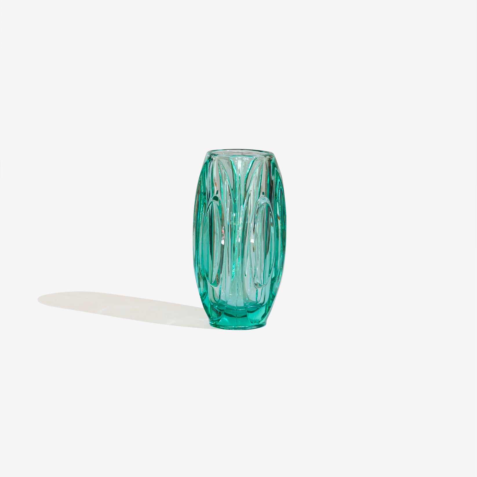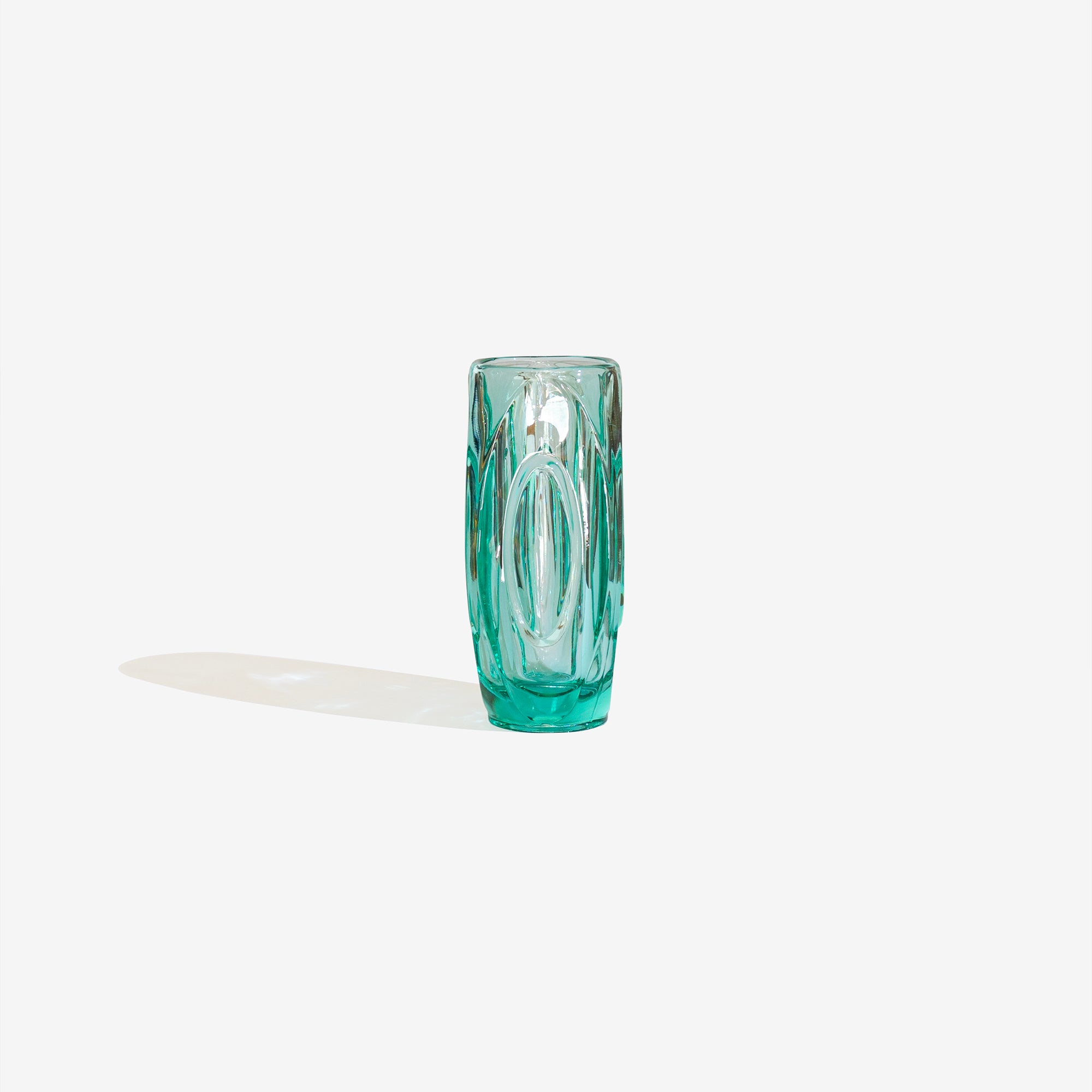 商品説明チェコのロシツェ・ガラス・ワークス社製のガラス製の花瓶。1955年製のRudolf Schrötter (ルドルフ・シュレッター)によるデザインです。