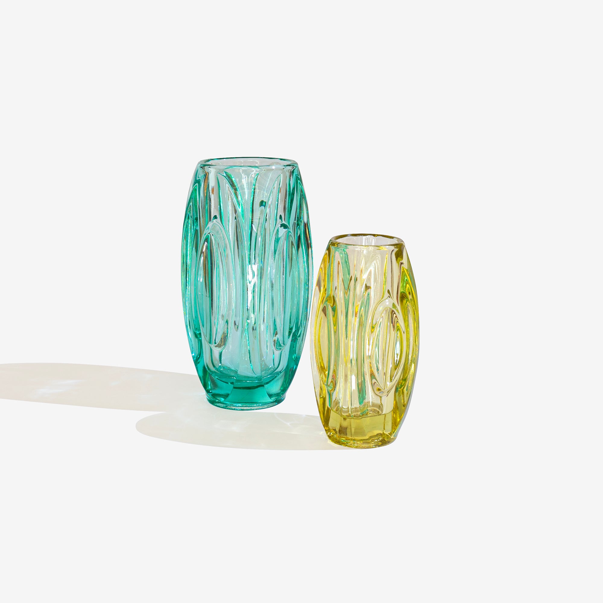 1920年ごろから高品質なガラス製品を生産していたチェコスロバキアで、第二次世界大戦後に衰退してしまったガラス産業。その再編を目指し、1965年に複数のガラス工場を統合してSKLO UNION(ガラス連合)という単一の組織が結成されました。Miloslav KlingerやRudolf Jurniklをはじめとする才能あるデザイナーたちが在籍し、革新的で美しいガラス作品が生み出されました。