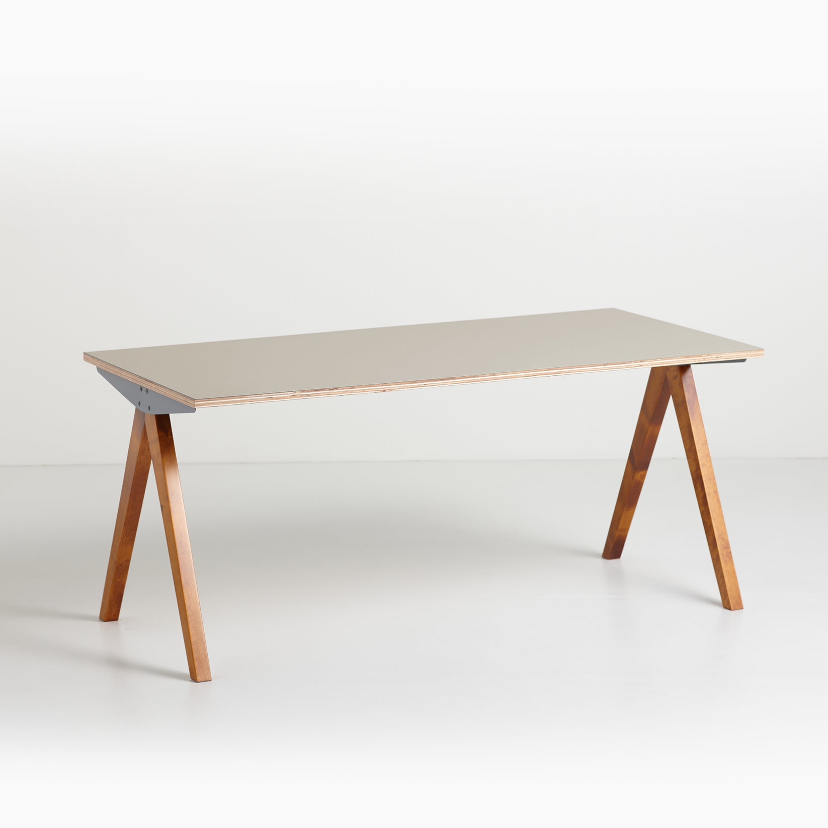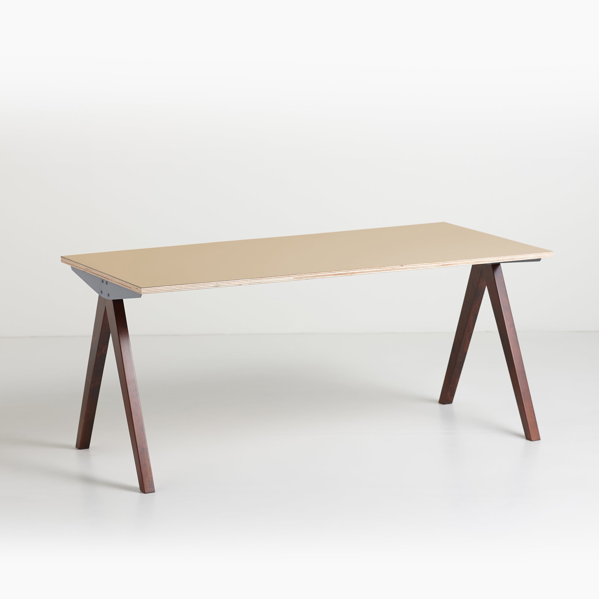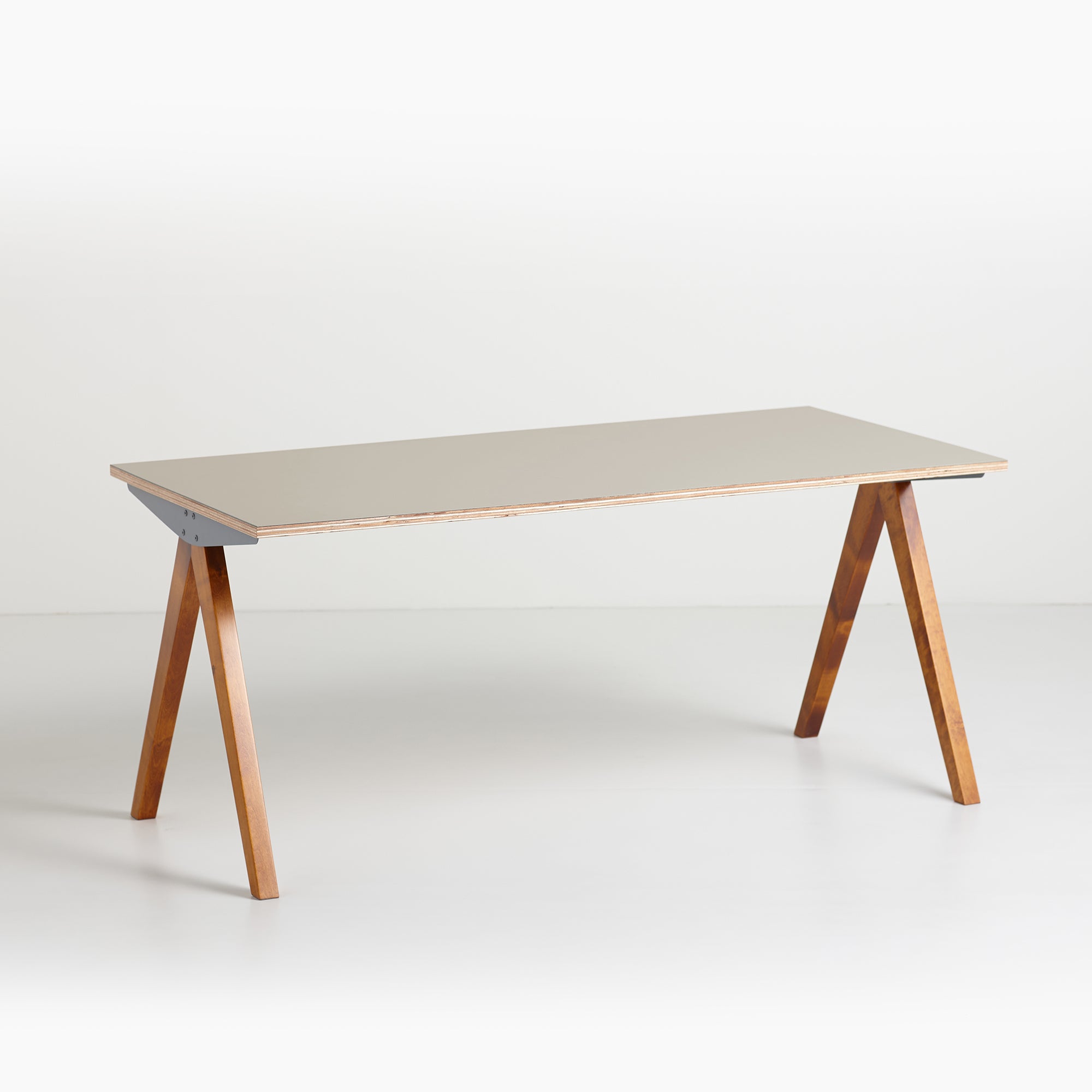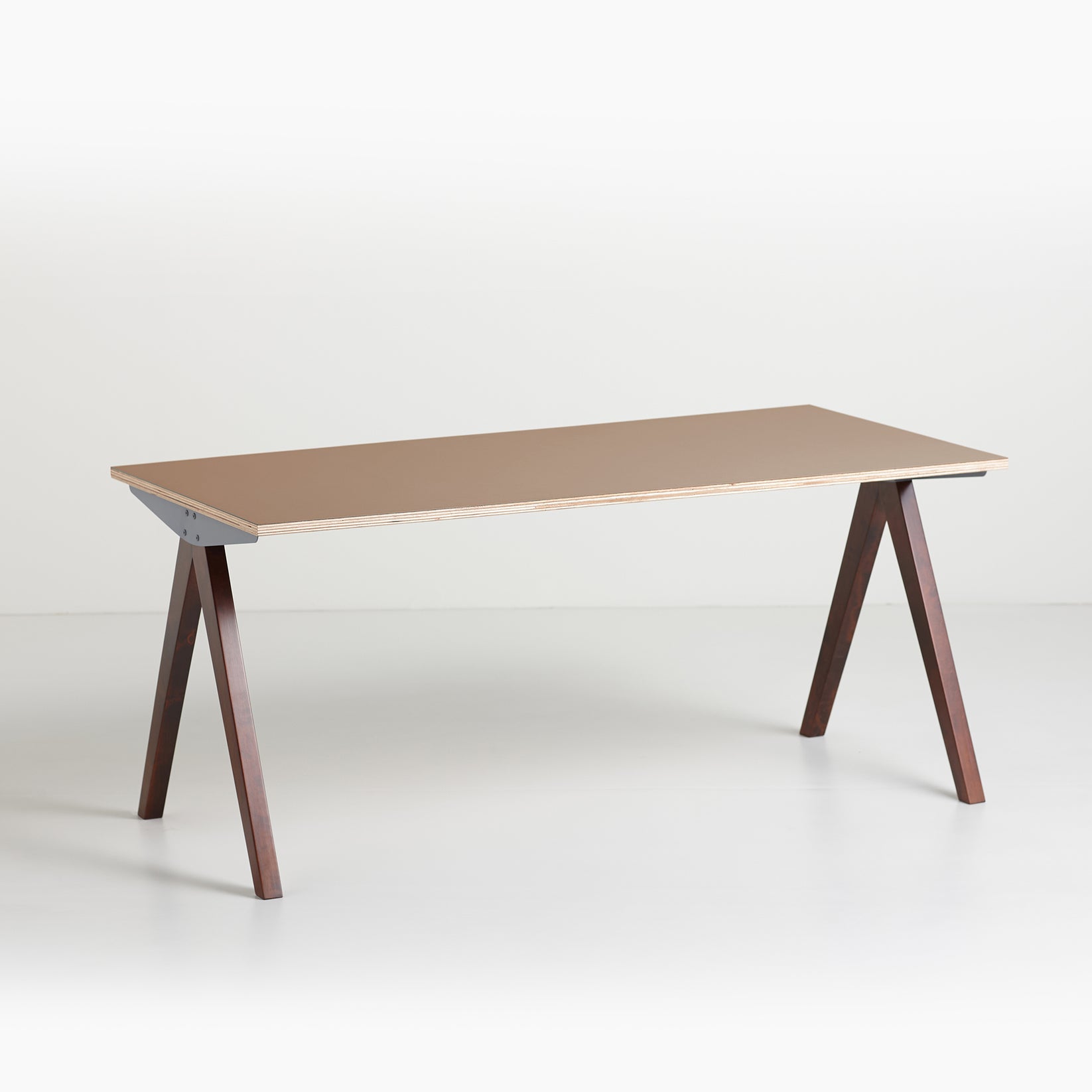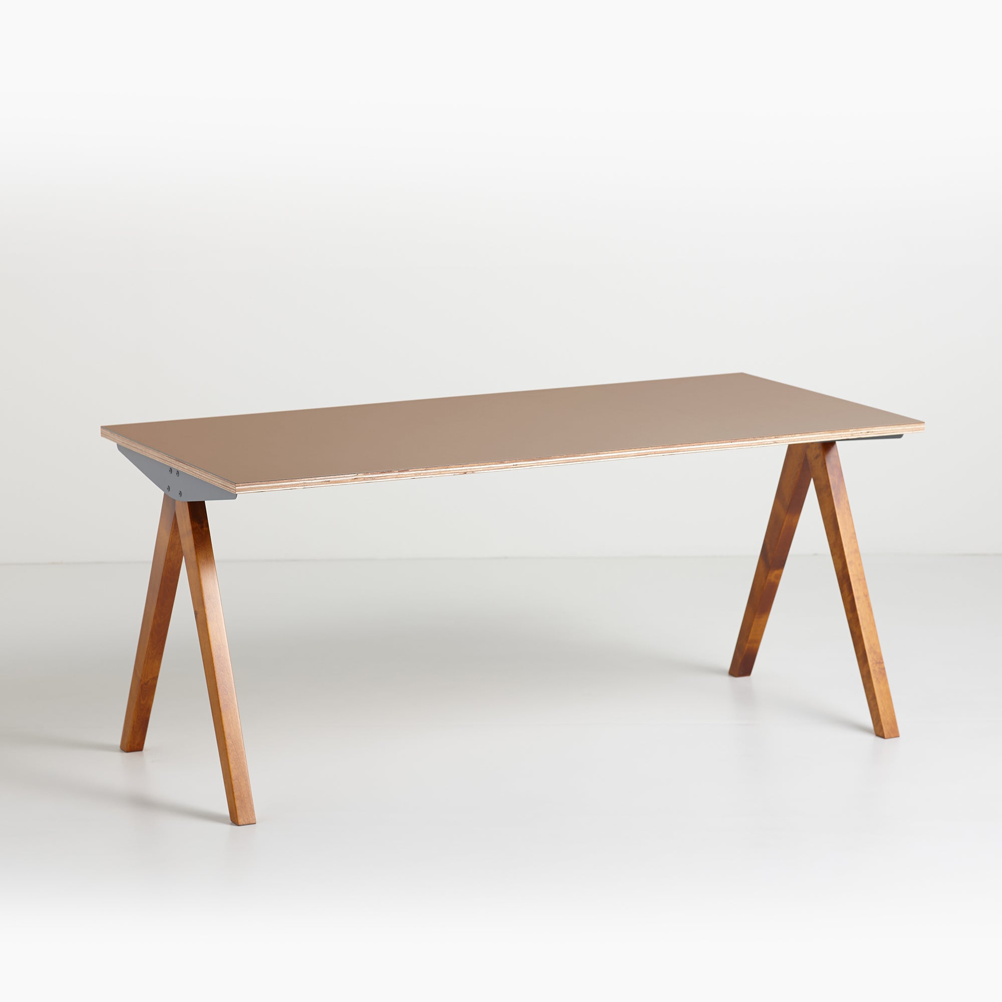 鉄と木を組み合わせたコンパスのようなシャープさが際立つデザインが特徴の脚です。脚の木部は染色塗装仕上げになっており3色から選択が可能で、鉄部は傷や錆に強い粉体塗装仕上を採用しています。