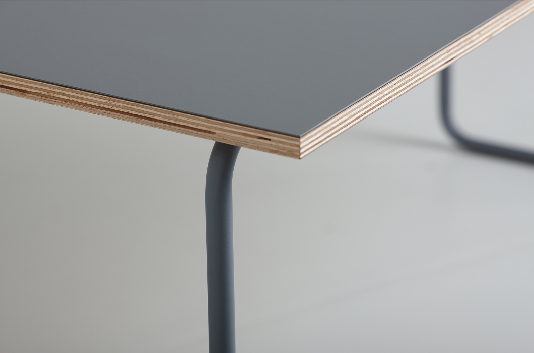 天板のリノリウムはスイスのForbo社製のものを採用しており、4色から選択可能です。Forbo社製のリノリウムは天然素材で作られており、マットな素材感で抗菌・抗ウイルス性の高い素材です。天板はパークサイドマーケット自社工場にて製作しますので、小口の加工などの細かな仕上がりもお選びいただけます。