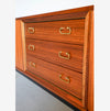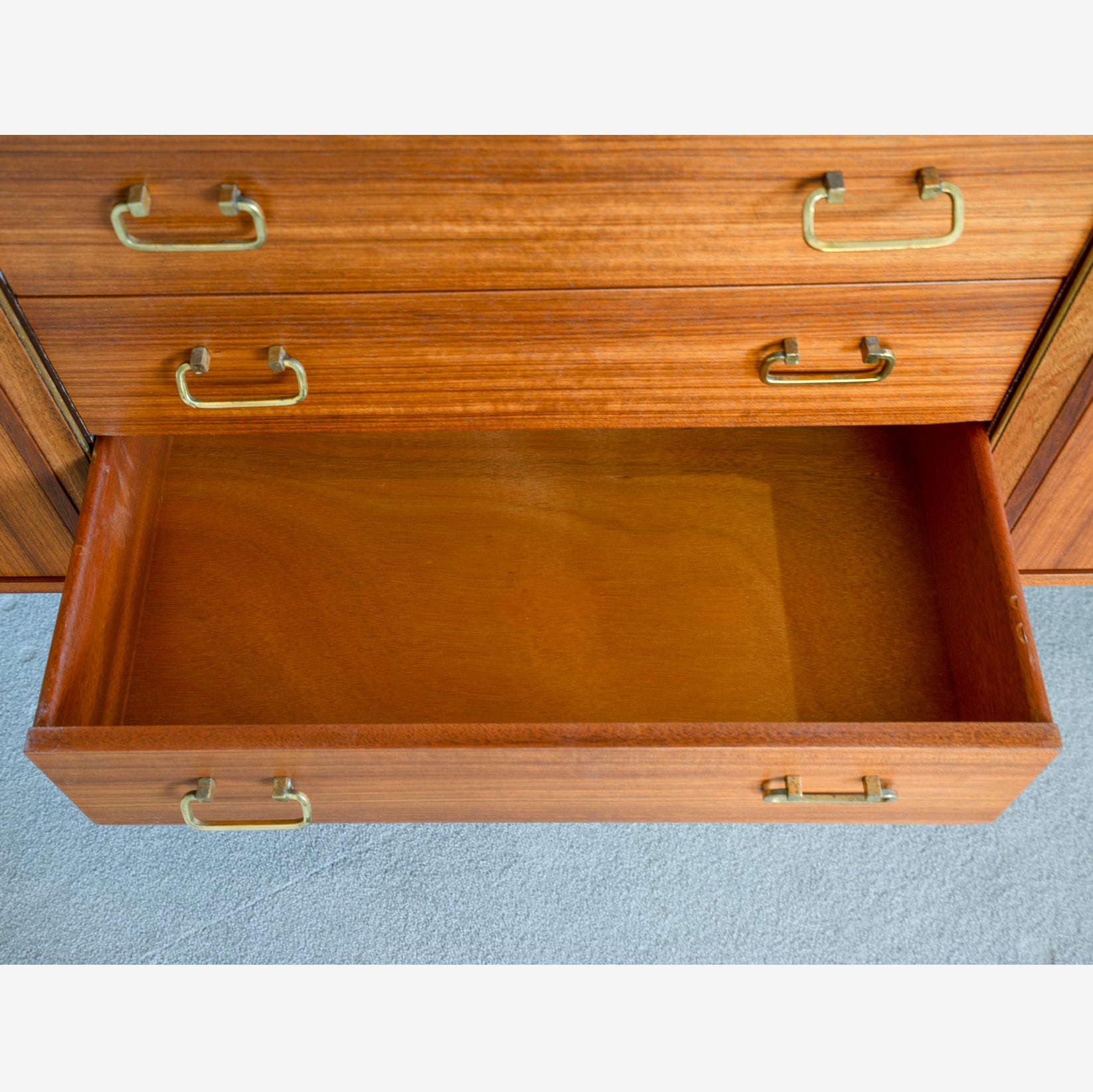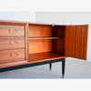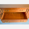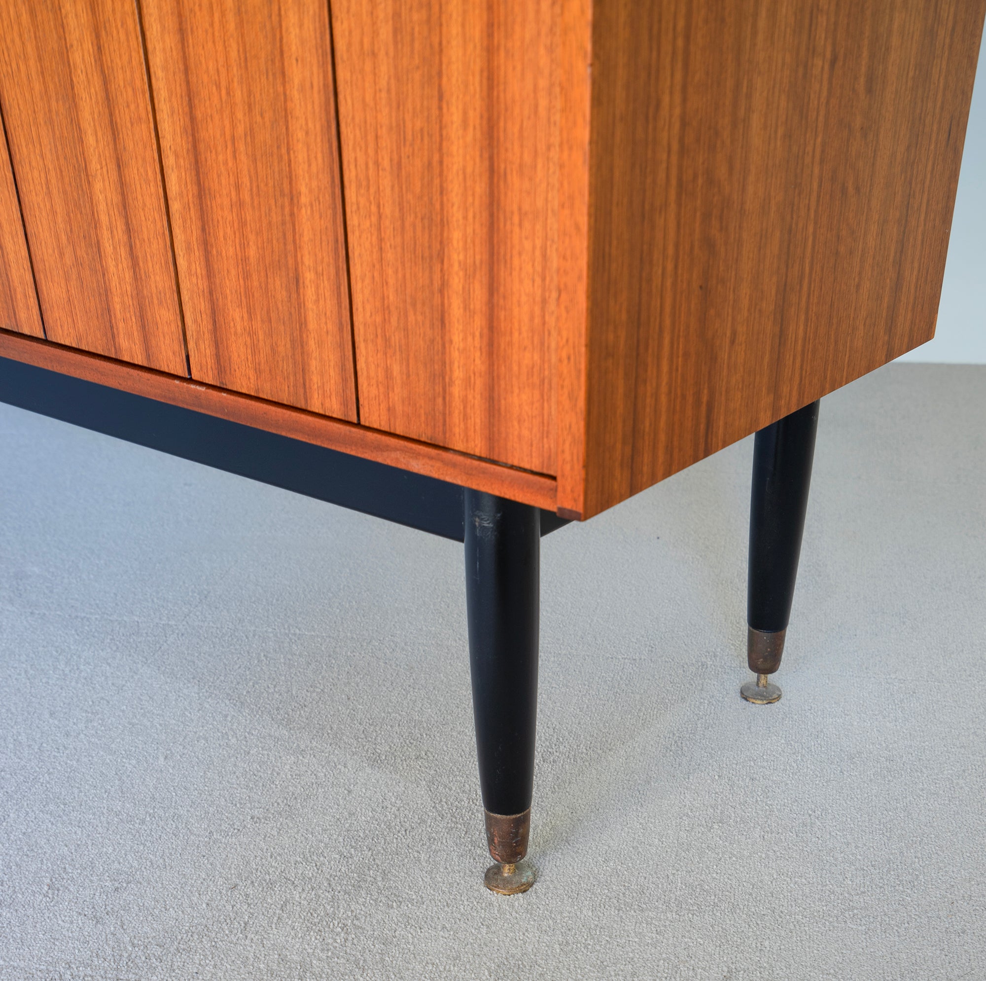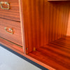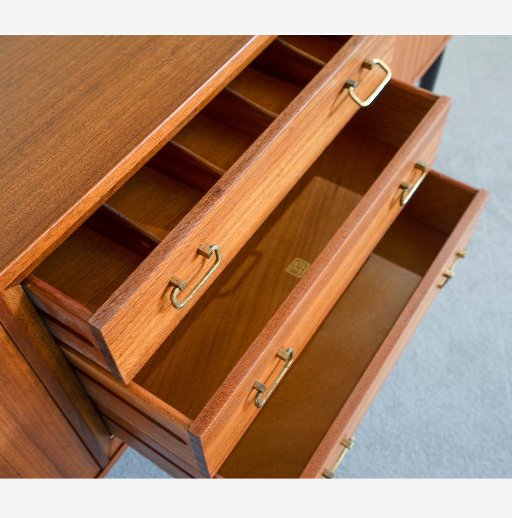 チーク材の濃淡のある木目が特徴で黒の脚部がシャープで美しく、扉の取手金物など細部など丁寧に作り込まれた家具です。収納力も豊富です。