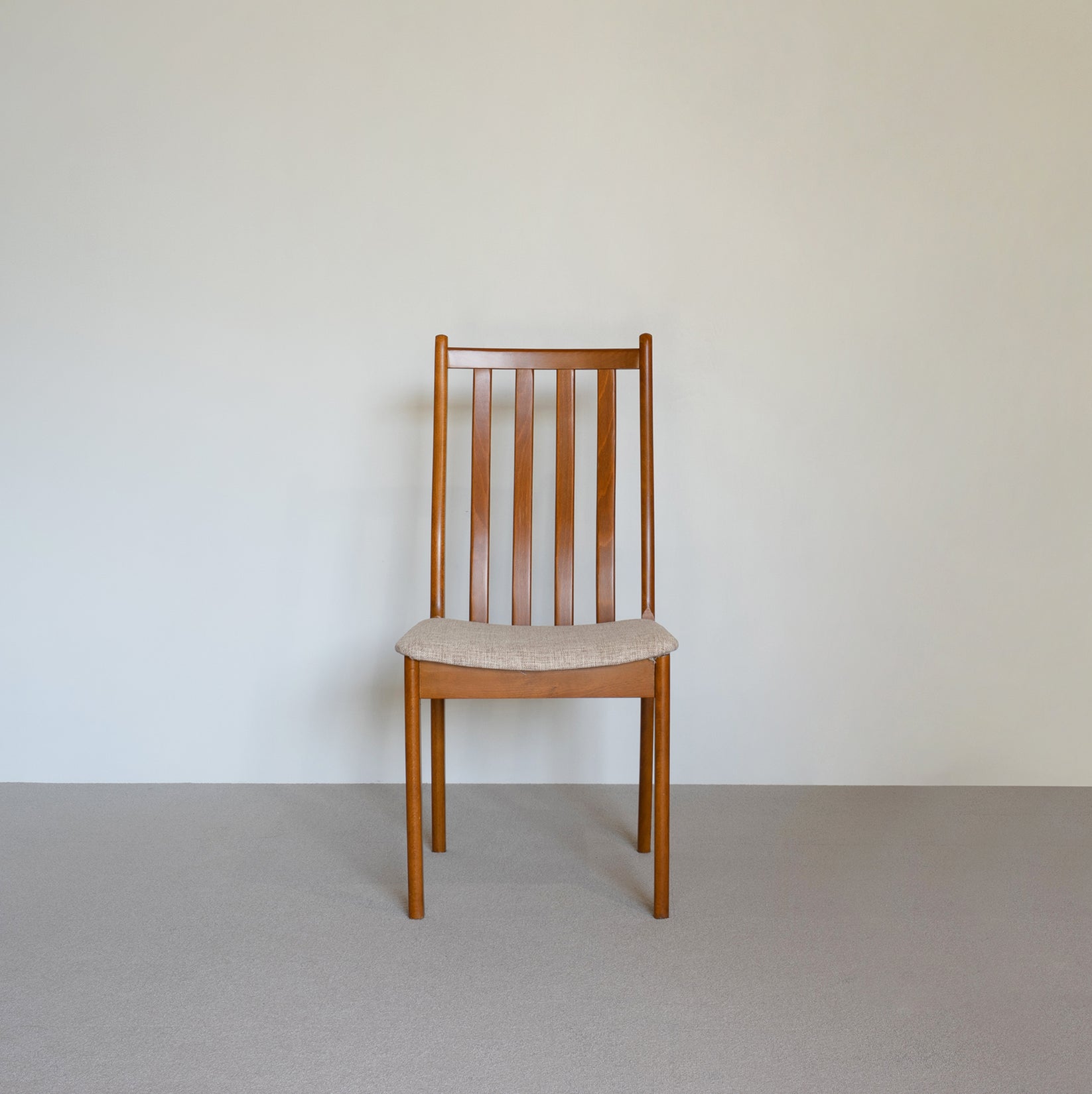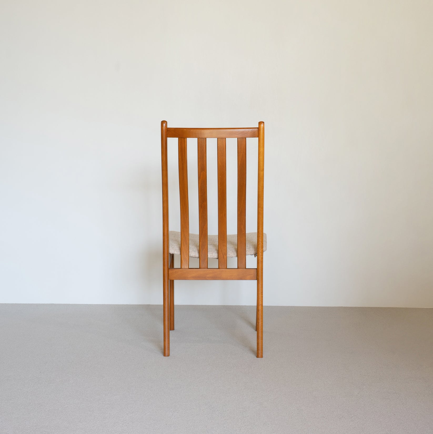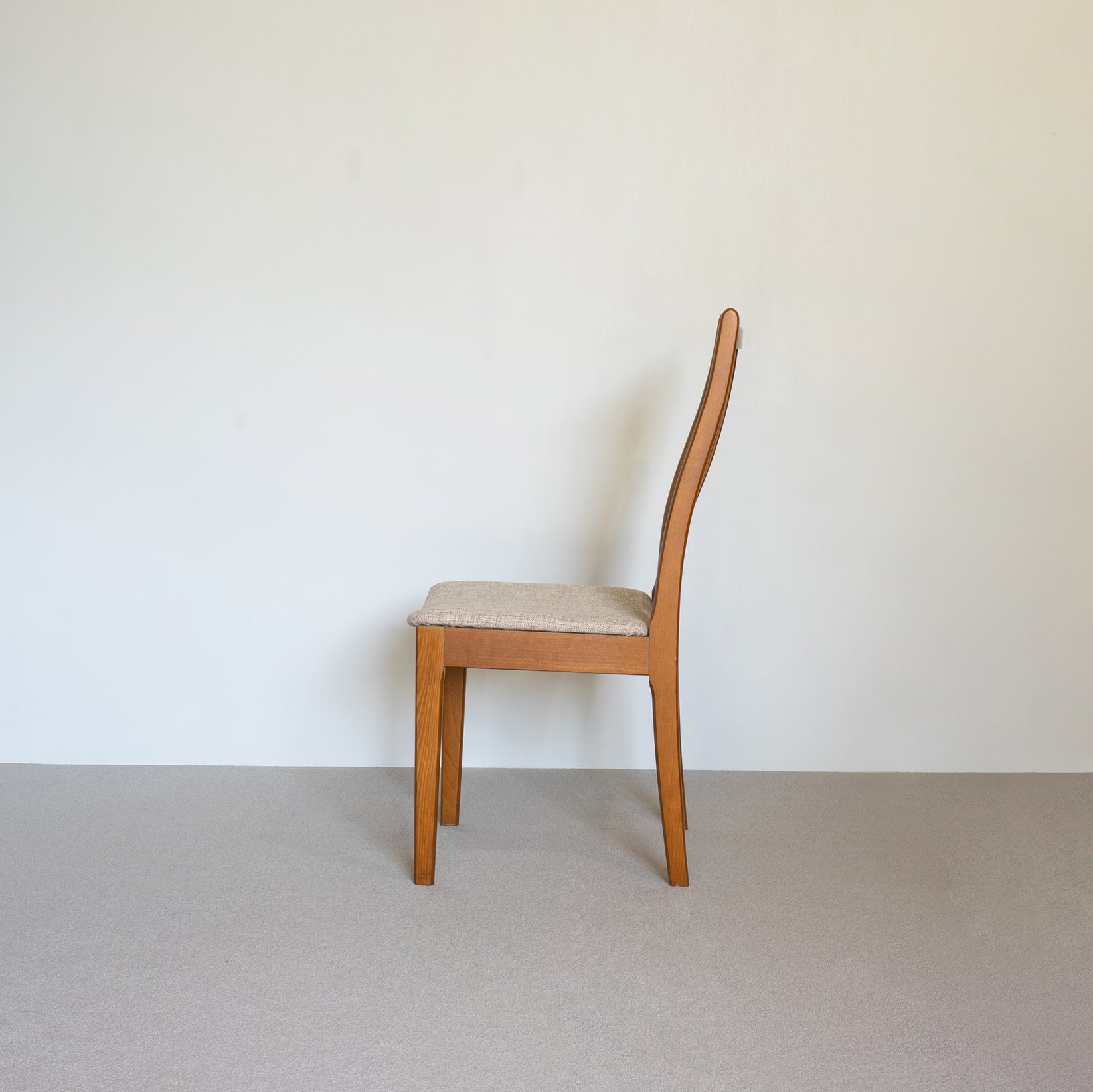 ハイバックの背もたれはS字に湾曲しており、座面にもカーブがあるためとても座り心地の良いチェアです。どのようなダイニングテーブルにも合わせやすい、シンプルなデザインも魅力です。座面張り替え済み。