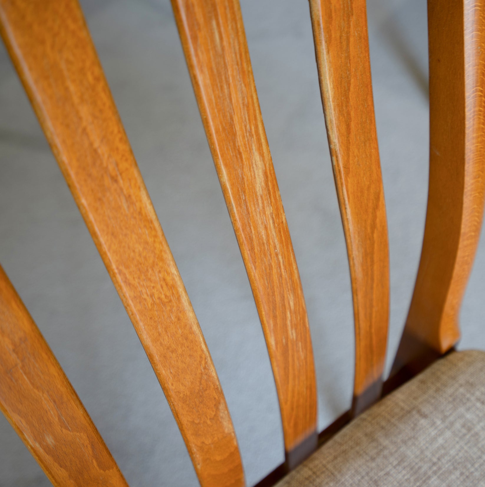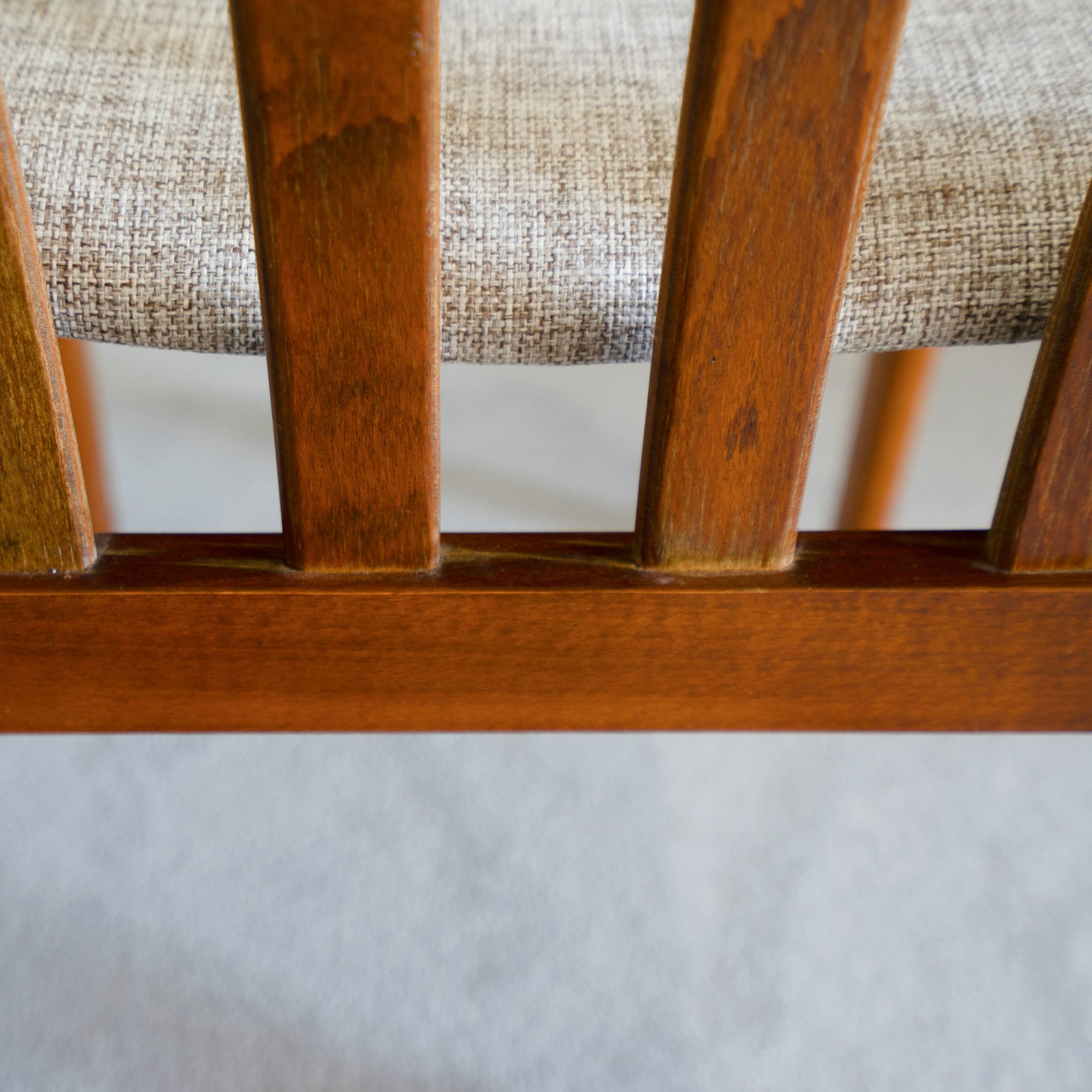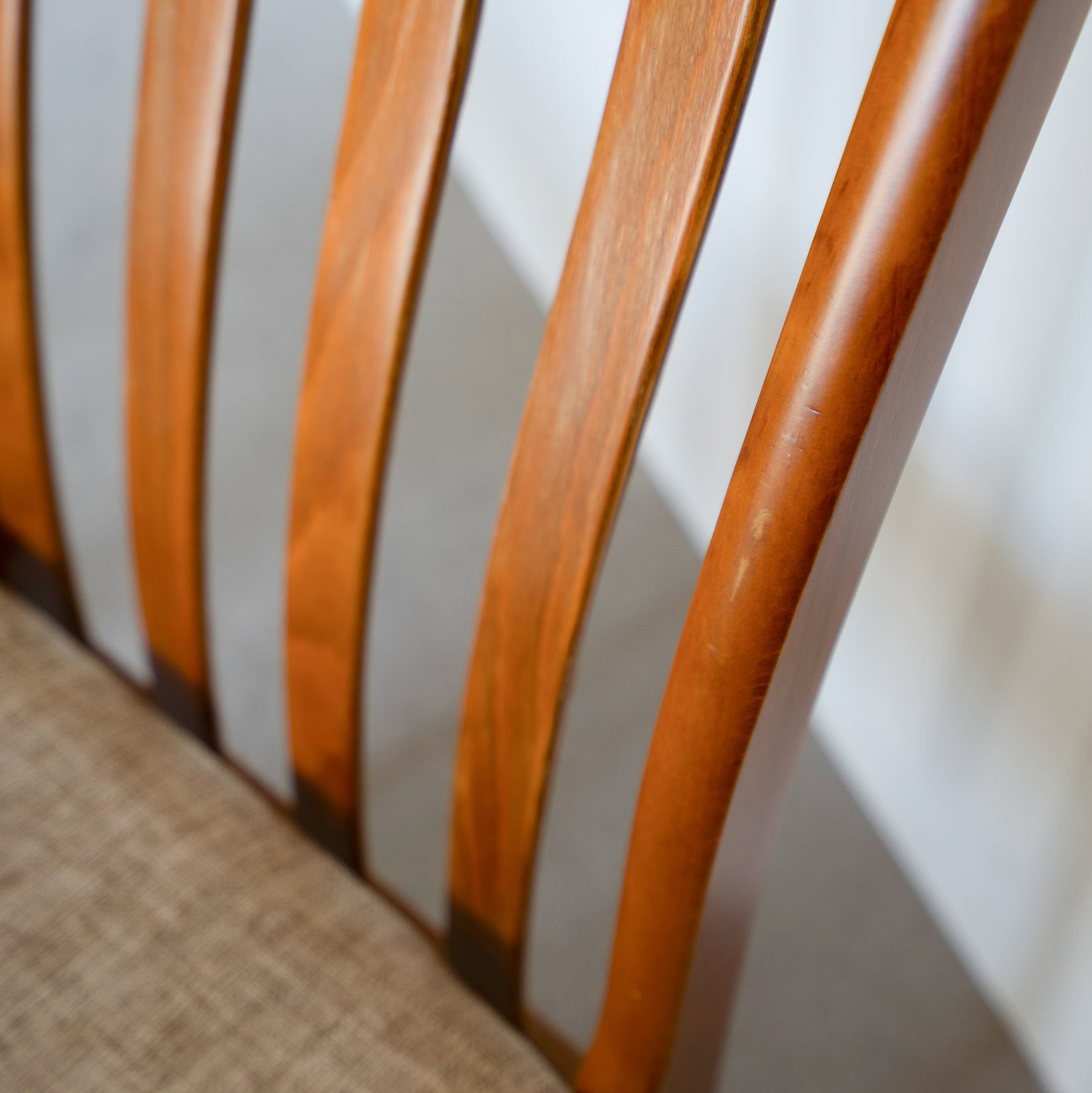 ハイバックの背もたれはS字に湾曲しており、座面にもカーブがあるためとても座り心地の良いチェアです。どのようなダイニングテーブルにも合わせやすい、シンプルなデザインも魅力です。座面張り替え済み。
