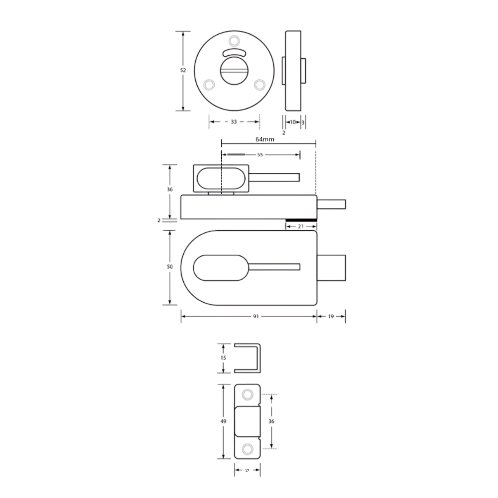 外寸 約 φ52 x D15 mm (表示錠側)、約 W91 x D38 x H50 mm (レバー部分)、対応ドア厚 12~45mm素材