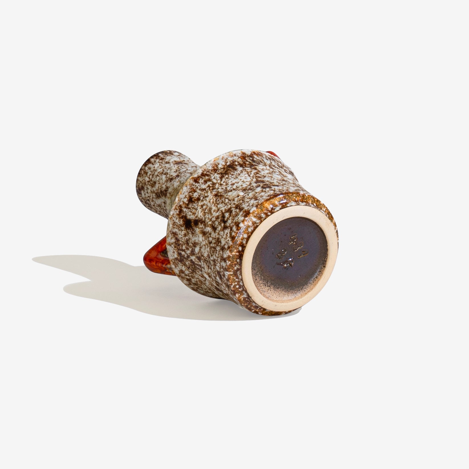 JOPEKO社が1970年代に製造した Fav Lavaのフラワーベース。「Prag」と呼ばれる濃いオレンジ色の「ファット・ラバ」釉が施され、特徴的な泡立ちと質感のある仕上げが特徴です。特徴的な2つのハンドルが、その美しさを引き立てています。