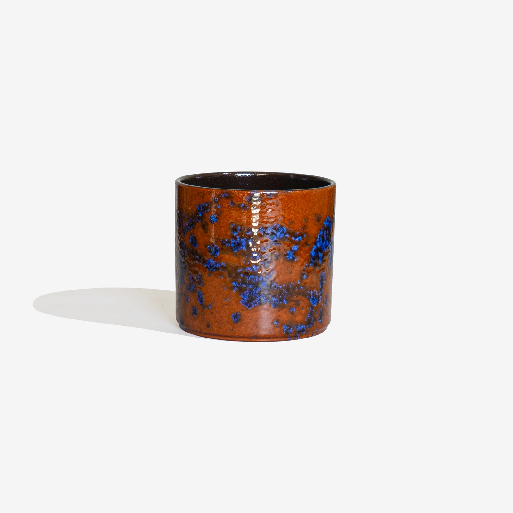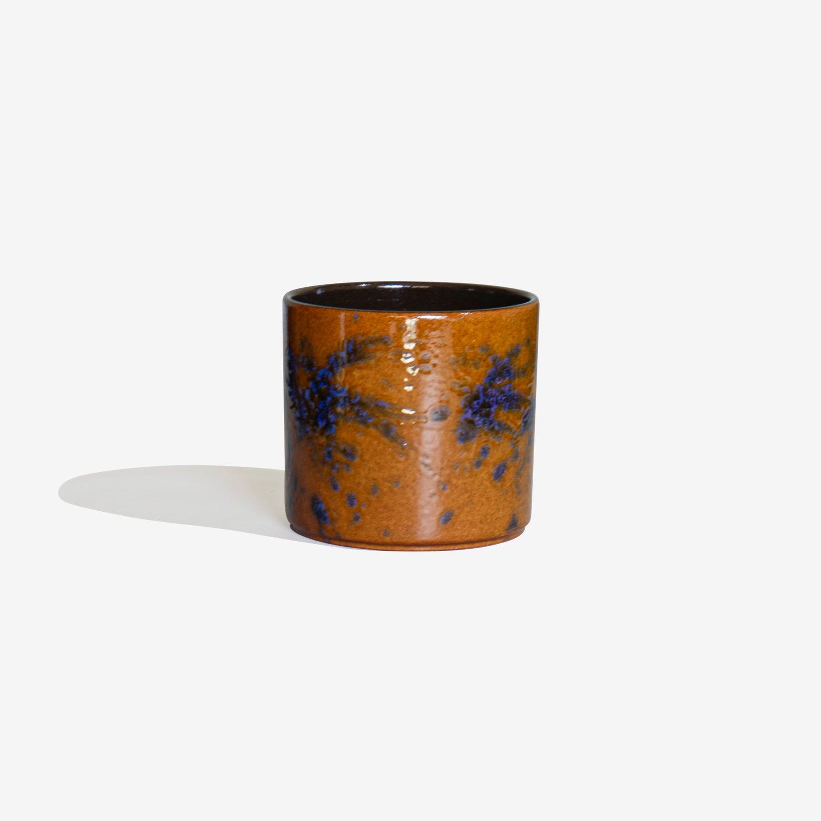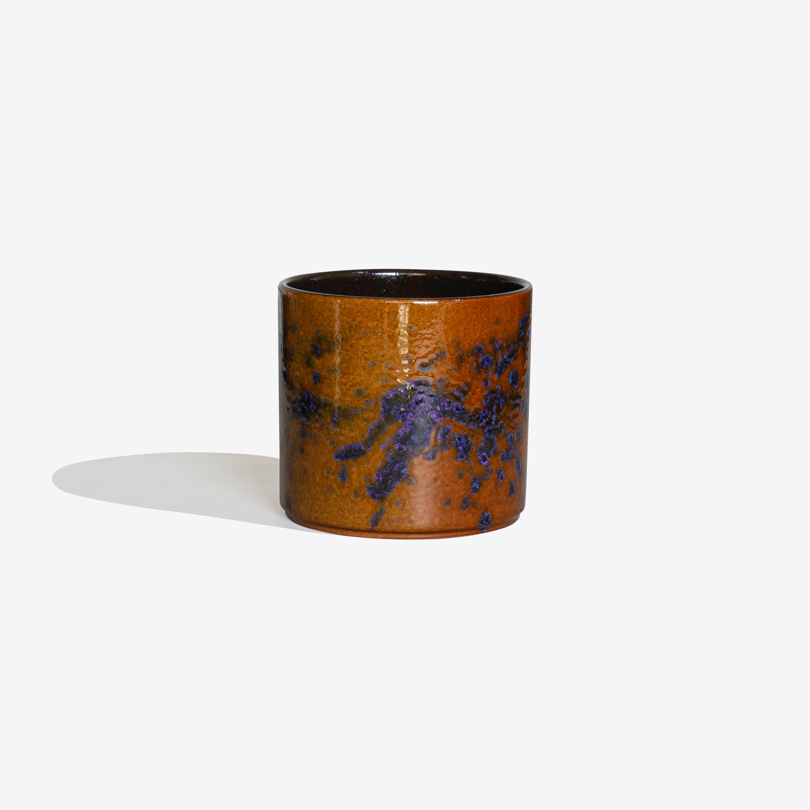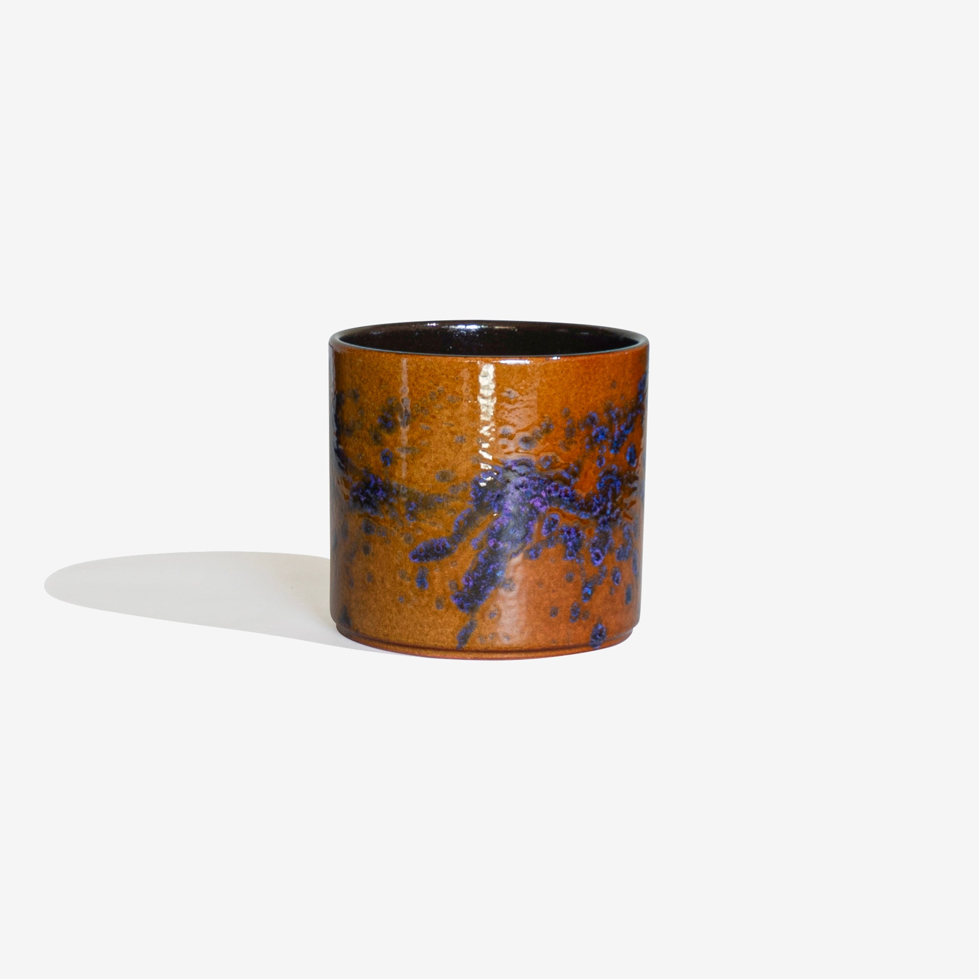 黄土色、紫、青の色合いで美しい色合いで仕上げられた珍しいポットです。サイズ:外寸 φ150 × H130 mm