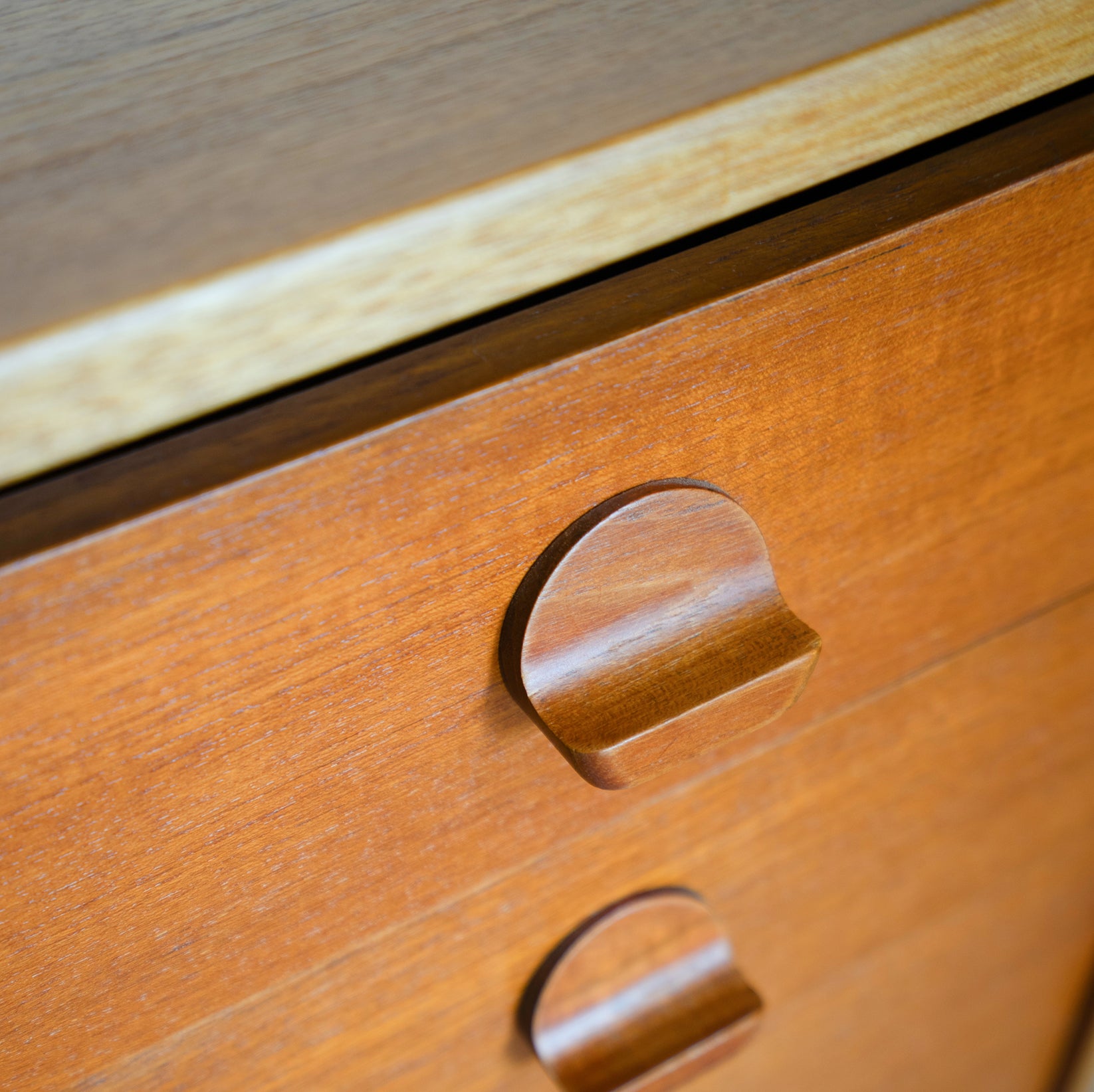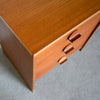 取手の形状など特徴があり、収納力のある両袖は床との間に空白があることですっきりとした印象です。美しいチーク材の木目も特徴です。