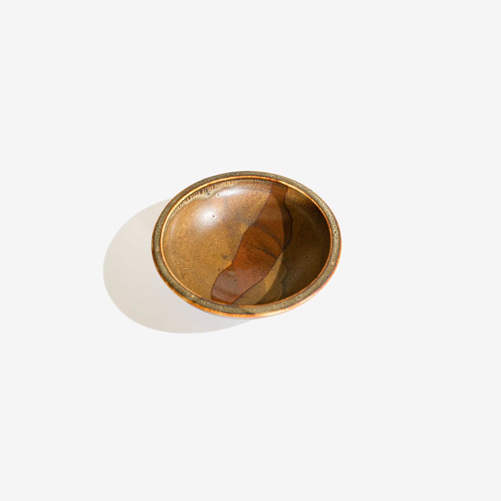 豊かなブラウンの色合いと繊細な斑点模様と層状の釉薬が、自然で素朴な質感を生み出しています。台座にはアーティストのイニシャルが刻まれています。